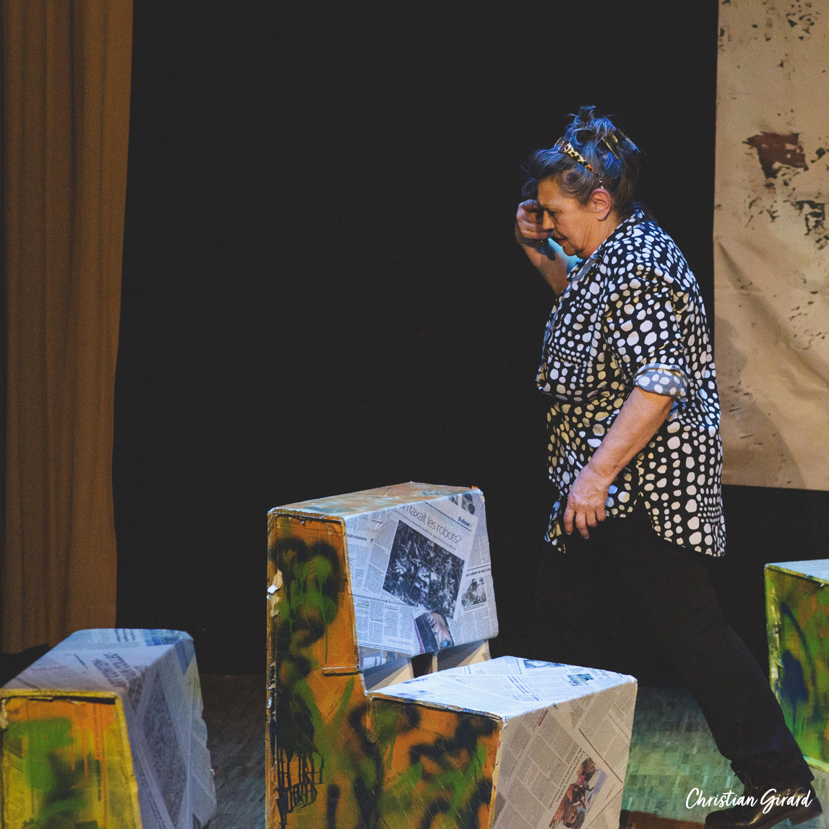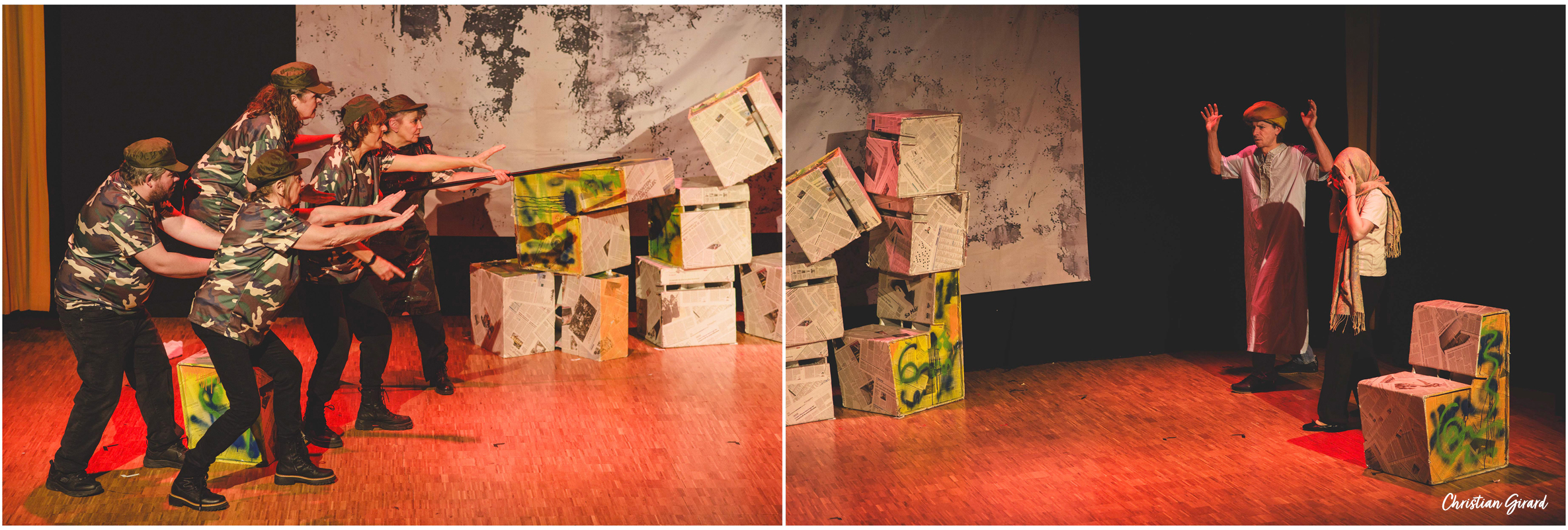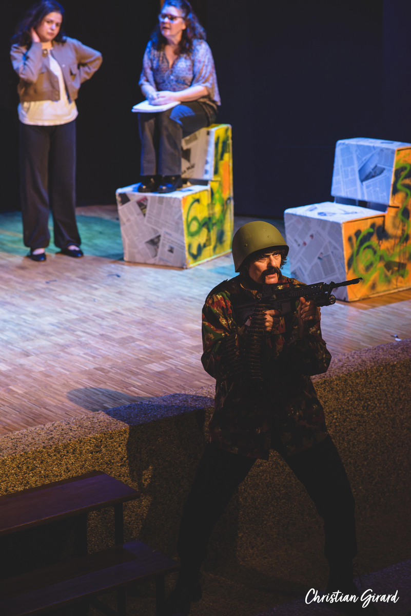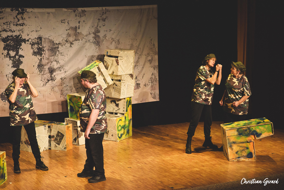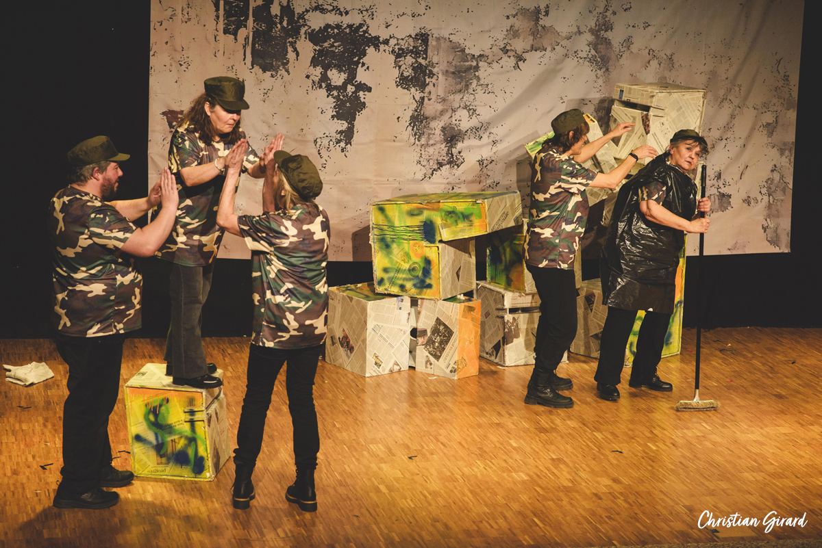 La pièce Intendance, écrite par Rémi De Vos, est une satire sociale où l’absurde et le comique servent à dénoncer les travers de notre monde contemporain. Elle s’articule autour de trois histoires qui s’entrecroisent : à Bagdad, des soldats américains sont mobilisés pour nettoyer les égouts de la ville ; à Springfield (USA), des habitants désœuvrés subissent l’absence de leurs proches partis à la guerre ; à Hollywood, un tournage met en lumière les caprices des acteurs, les censures du pouvoir et les doutes artistiques, le tout rythmé par l’absurde. Cette parodie du modèle américain et sociétal donne lieu à une comédie mordante et incisive.